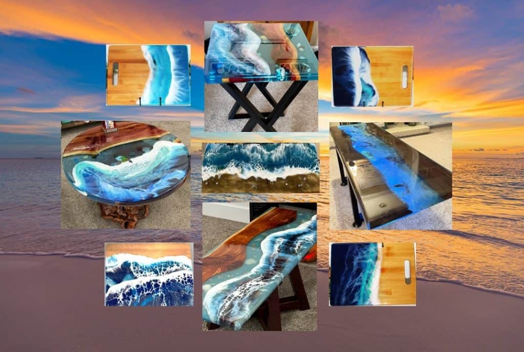 Discover exquisite, handcrafted pieces that artfully combine wood and resin, drawing inspiration from the ocean’s beauty. Each creation brings unique charm and refined elegance to your home or special event.